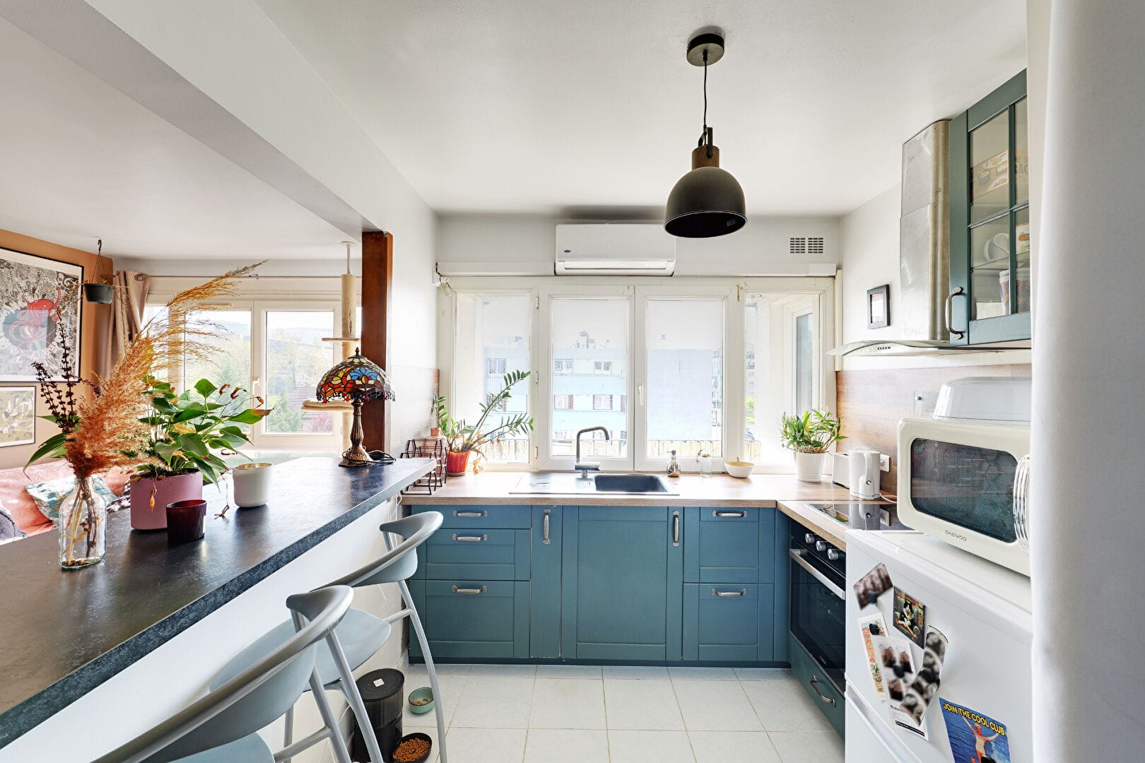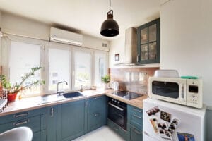 -une cuisine ouverte, meublée et équipée,