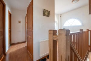 A l’étage, un grand palier dessert deux chambres, une salle de bains et des WC.